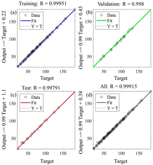 The shallow neural networks with eight hidden neurons perfectly fit the training data set (70% of the data; Figure 7a) where the data lie on a line with a slope of R = 0.99951 (the 45° line) in the output vs. target plot. It is also worth mentioning that the ANNs work precisely for other data sets as well, e.g., the fit to the validation, test, and all datasets are shown in Figure 7b–d, respectively. This proves the fact that shallow ANNs can perfectly map the inputs to the output without any bias or variance problem.
