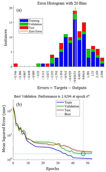 The performance of the ANN on the training, validation, and test datasets are depicted in terms of (a) the error histogram and (b) the MSE during various training cycles.