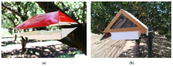 Figure 1. Monitoring devices used in the current study: (a) A conventional sticky trap with a glue-lined lower liner (other descriptions of sticky traps can be found in references [7,14,22]); (b) A pseudoacoustic optical sensor trap deployed in a pistachio orchard. Infrared sensors inside the frame on the opposite side of the trap detect wing frequency from navel orangeworm adults drawn into the device by attractants. The sensor communicates with a server via a cellular SIM card and frequencies unique to navel orangeworm are identified on the server by machine learning algorithms. The battery-powered device is recharge by a solar panel located on the top of the device.