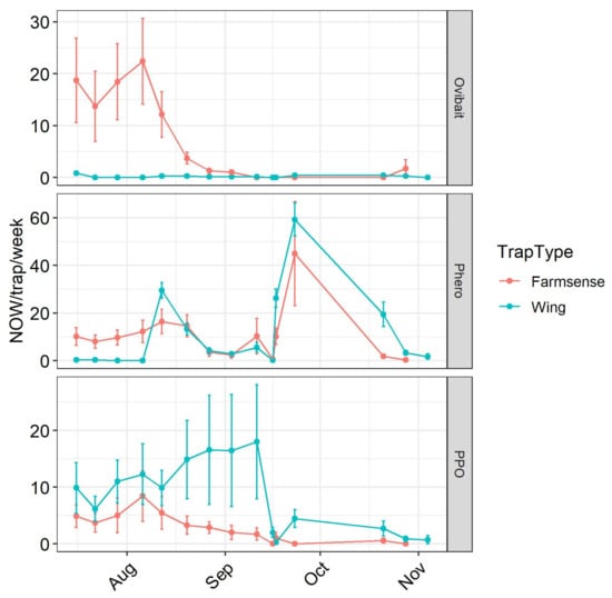 Figure 5. Seasonal phenology of navel orangeworm captured in conventional sticky wing traps or detected with a FarmSense pseudoacoustic sensor with either a female ovipostional bait, a pheromone monitoring lure, or a phenyl propionate (PPO) dispenser as an attractant. Points and error bars represent mean and standard error (n = 7).