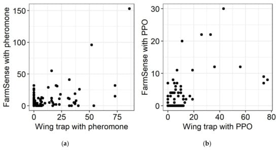 When the attractant was phenyl propionate, the number of captures in sticky traps was generally greater than the number of detection events in sensors (Figure 3, lower panel). Compared to traps and sensors with pheromone, Pearson correlation indicated a higher level of association between events in sensors and captures in wing traps in the same plots during the same intervals (ρ = 0.47, p < 0.0001) (Figure 4a,b). However, weekly trends were different between trap counts and detections with the sensor, and variability was high with the sticky traps (Figure 3, bottom).