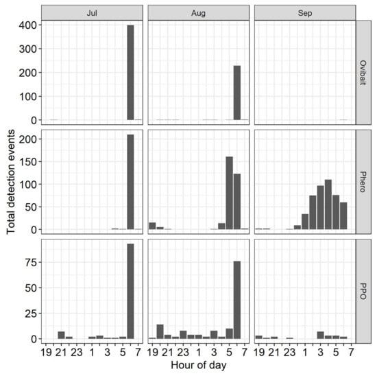 In addition, differences in time of capture in the sensor events were examined by total detections by hour of the night in July, August, and September in devices baited with ovibait, pheromone, or phenyl propionate.