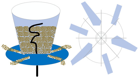 - The centrifugal fertilizer ejector uses the rotating disk at the bottom to scatter fertilizer particles under the action of centrifugal force. It is mainly applicable to granular and powdery fertilizers with good fluidity. The rotating disk at the bottom of the fertilizer ejector has a high speed. The working width of the fertilizer ejector will be determined when its speed is fixed (Figure 5). At this time, the amount of fertilizer discharged per hectare is mainly related to the travel speed of machines and tools. The faster the travel speed of machines and tools, the greater the amount of fertilizer discharged [98,99].