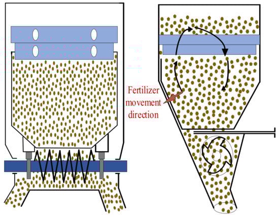 - Spiral vertebral body centrifugal fertilizer ejector. The smoothness of fertilizer discharge depends on the arching principle of bulk materials above the rectangular discharge port. However, the discharge port easily forms a spherical cavity, which prevents the granular fertilizer from moving down smoothly. Applying external force to the granular fertilizer with spiral blades can effectively prevent its arching and the formation of a cavity. At the same time, the agglomerated fertilizer is disturbed and broken to ensure the smooth downward movement and discharge of the granular fertilizer. To ensure that the granular fertilizer is evenly distributed around the vertebrae, and at the same time, according to the principle of centrifugal seed discharge, the centrifugal fertilizer discharging mode is adopted to ensure the uniformity of the fertilizer entering the fertilizer chamber. A centrifugal push plate at a certain angle with the radial longitudinal section of the fertilizer discharge device is designed to improve the stability of fertilizer discharge capacity and prevent the granular fertilizer from continuously and stably moving to the outer edge under the action of centrifugal force due to insufficient friction. Considering the influence of the traditional fertilizer ejector on the fertilizer discharge performance due to the overhead arching and blockage of fertilizer, Professor Liu of Huazhong Agricultural University analyzed the movement model of granular fertilizer in the fertilizer discharge process of a spiral cone centrifugal fertilizer ejector and the mechanism of disturbance arch breaking and antiblocking. The centrifugal fertilizer ejector with spiral disturbance vertebral body was then designed, as shown in Figure 10, which is mainly composed of an upper shell, a spiral disturbance vertebral disk, and a lower shell [98,99].