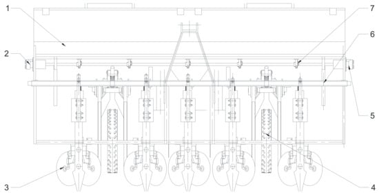 Figure 8. Structure of variable rate fertilization mechanism. 1: Fertilizer bin; 2: Opening motor; 3: Trenching and earth covering device; 4: Profiling wheel structure; 5: Speed motor; 6: Rack; 7: Fertilizer discharging device.