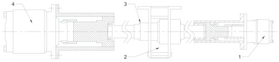 Figure 9. Double regulating mechanism structure of speed and opening. 1: Speed hydraulic motor; 2: Fertilizer discharge box; 3: Fertilizer discharge stop shaft; 4: Opening hydraulic motor.