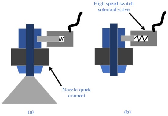 - PWM is the process where the liquid is mixed in the box in advance; the pipeline pressure is kept constant within a certain flow regulation range, and the nozzle flow is adjusted by controlling the on–off frequency and duty cycle of the nozzle solenoid valve, so as to achieve the effect of variable application. As shown in Figure 11, PWM requires a high response frequency of solenoid valve and needs to respond quickly to the pulse signal. Therefore, a high-frequency solenoid valve is usually used [121,122,123].
