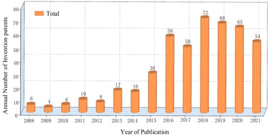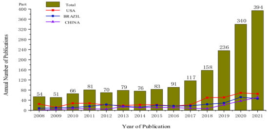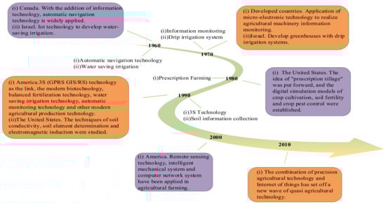 Figure 15 shows the key timetable for the development of precision agriculture in relevant countries and the core research objects. After the introduction of precision agriculture technology in 1960, many modern scientific and technological elements were derived. These elements can be divided into three key stages. The first stage is agricultural information collection technology; the second is information processing and decision-making technology, and the third is information execution technology. Each of them is proposed to ensure the quality and quantity of crops [127,128,129,130,131]. A large number of documents have been published and widely studied with the proposal of precision agriculture technology. However, bibliometric analysis is an effective tool for the quantitative analysis of scientific publications, research trends, hotspots, and cooperation relationships to comprehensively understand the current situation and future trend of precision agriculture. The published articles were searched by SCI-E on 10 April 2022 and analyzed by CiteSpace and bibliometrics. The search method was a keyword search, and the content was “precision agriculture”. Figure 16 shows the annual number and trend of documents issued in precision agriculture from 2008 to 2021. The attention in this field has increased since 2008. In particular, the annual number of documents issued in this field has increased significantly since 2016 and exceeded 100 in 2017. China, Brazil, and the United States are the main contributors to the number of documents published in this field. As the world’s most advanced scientific and technological power, the United States has always been in the forefront of research on advanced technology. In recent years, the number of documents issued by China and Brazil has increased, and they have been the main contributors in this field. In particular, the number of documents issued by China in this field has shown a straight-line upward trend since 2018, which reflects China’s attention to agricultural green, environmental protection, and low-carbon transformation.