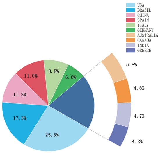 Researchers from 99 countries and regions have conducted detailed and extensive research in this field from 2008 to 2022 through the quantitative analysis of the academic literature published in the field of precision agriculture. Figure 17 shows the top 10 most productive countries/regions. Among them, the literature published by the United States ranks first in the world (about 25.5%), followed by Brazil (about 17.3%), and China ranks third (about 11.3%), and Spain (about 11%) and Italy (about 8.8%) rank fourth and fifth, respectively. Figure 18 shows the cooperation relationship of the top 20 most productive countries/regions. The larger the circle, the more cited; the thicker the connecting line, the more cooperation, and the darker the color, the older the year. The number of citations in American literature is the highest.