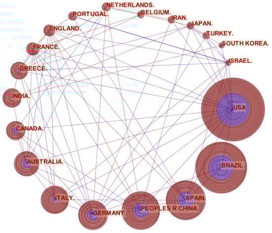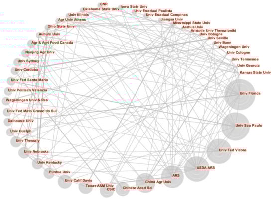 Figure 19 shows that more detailed and specific information can be achieved by scholars through the statistical analysis of research institutions. Among the top 40 most productive research institutions, most of them are from the top 10 countries. The University of Florida ranks first with 19 articles, followed by the agricultural organization of the U.S. Department of Research and the University of Sao Paulo in Brazil. In terms of TC (total citations), the University of Florida ranked first (19), followed by the agricultural organization of the United States Department of Research (17) and the University of Sao Paulo in Brazil (15). The cooperative relationship among organizations can send a message of cooperation intention to researchers, so as to help scholars cooperate more. Figure 19 shows the cooperation relationship among the institutions with 5 or more papers among the top 100 highly cited papers from 2008 to 2022, where the larger circle size represents the more cited papers, and the thicker connecting line represents the more cooperation between the two. From the figure, cooperation has become the choice of various institutions, and most institutions have more or less cooperative relations.