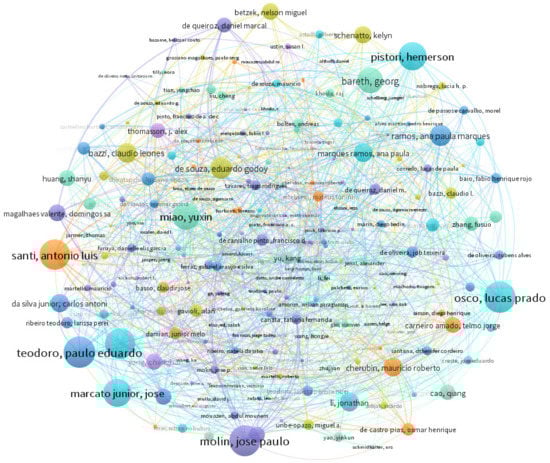 As shown in Figure 20, the academic contribution of precision agriculture comes from different research teams, and that the research team is scattered by analyzing the relationship between the author and cocitation. The size of the text in the figure represents the influence of the work. Molin JP, Teodoro PE, and Osco LP are the extremely active representative researchers in this field. These active teams and authors also focus on greater contributions. Molin JP and others are mainly interested in GPS and sensor technology of information acquisition technology in precision agriculture. Teodoro PE and Osco LP are mainly interested in UAV and remote sensing vegetation spectrum prediction.