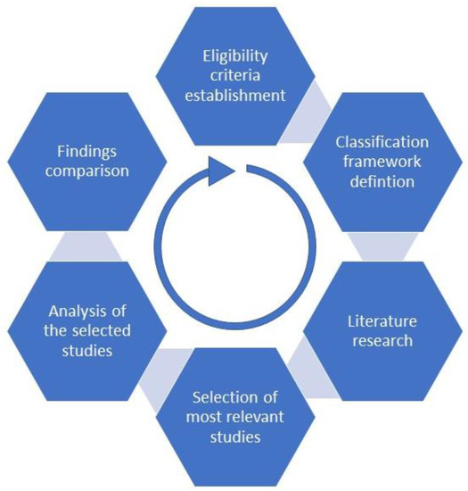 Before conducting the review, several theoretical considerations were considered that led to establishing methodological steps, as presented in Figure 1: (i) establishment of eligibility criteria, (ii) definition of the classification framework, (iii) literature research based on the prior established criteria, (iv) selection of the most relevant studies for each identified class, (v) analysis of the selected studies, and (vi) comparison of the findings.