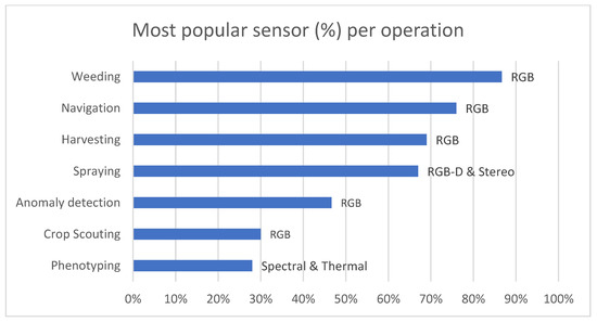 Those solutions depend heavily on vision as they try to introduce a second pair of eyes in the field, increasing the field data collected. The vision devices used vary based on the trait being investigated. Common devices used are color cameras [25], spectral cameras [26,27], various sensors measuring plant light reflectance such as IR radiometers and OptRX sensors [28,29], and stereo cameras [30]. Measurements coming from these sensors could be used in real-time as long as the sensors are factory calibrated. An example is vegetation index measurements [26,27]. On other occasions, AI algorithms have to be used to translate sensor data into meaningful and actionable information. Examples include background segmentation, object detection, and predictive algorithms (Table 2).