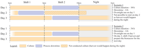 On top of the time required for the culture to grow, industrial processes also have to face technical downtime after the operation (harvesting, cleaning, sterilization, reloading) and operator teams shifts. Here we assumed a 6 h process downtime, as classically reported for yeast cultivation [32,33] and a factory operating in two shifts (6–14 h and 14–22 h, 6 days a week). With this additional information, it is possible to compute the number of runs that an actual factory can perform over a week. Knowing the number of run and the final yeast concentration, it is possible to compute the process productivity in gYeast/w/L. To illustrate this, Figure 2 presents two examples of process configuration. The first scenario is a case where the cultivation time is relatively short. In this case, the process downtime is high compared to production time. Furthermore, the need for frequent harvests imposes constraints on the process planning (e.g., on day 2, the production is not possible in the afternoon). All this indeed hinders profitability. On the contrary, extremely long runs (not exemplified) would ease those constraints. Still, they would be achieved because of poor biological performances (low growth rate, mainly) and not be profitable either. Finally, scenario 2 represents an in-between configuration. The cultivation time is long enough to allow for overnight operation. Downtimes match the different worker shifts, making the process easy to plan and the ratio of cultivation and maintenance times acceptable.
