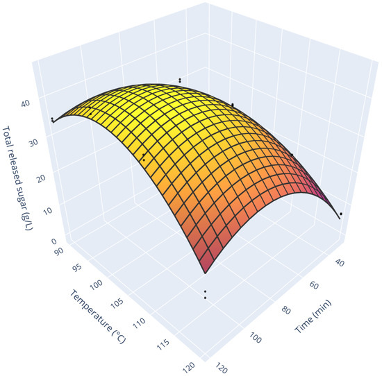 Response surface of the concentration of the total sugar (glucose + fructose) released by acid hydrolysis. Runs 21 and 23 excluded.