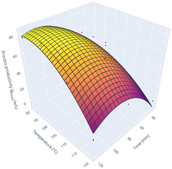 Figure 6 displays the process productivity for all the tested conditions. As one can see, this response surface resembles the one for total sugar release. Still, it is modulated by the growth rate (e.g., very low process productivity for high treatment duration and high temperature). Two comments can be drawn from this graph. While low treatment time and low temperature allow the fastest yeast growth, they also release a relatively low amount of sugars. Consequently, the cultivation time is short (3 h cultivation time for the run 22, fast growth with little substrate), and process productivity is hindered by numerous downtimes (scenario 1 on Figure 2). On the opposite, high treatment duration and high-temperature results in very long cultivation runs (63 h cultivation time for the run 19, slow growth with a moderate amount of substrate). In this case, the poor biological performances undermine profitability. The maximum process productivity lies in-between those two extremes at 82.8 gYeast/w/L for acid hydrolysis of 103 min at 94 °C. Furthermore, this maximum is relatively stable. Indeed, to get a 10% productivity decrease, one should either lower process time by 26 min (keeping the temperature at 94 °C) or lower temperature by 11 °C (keeping process time constant). This stability ensures robust process operation.