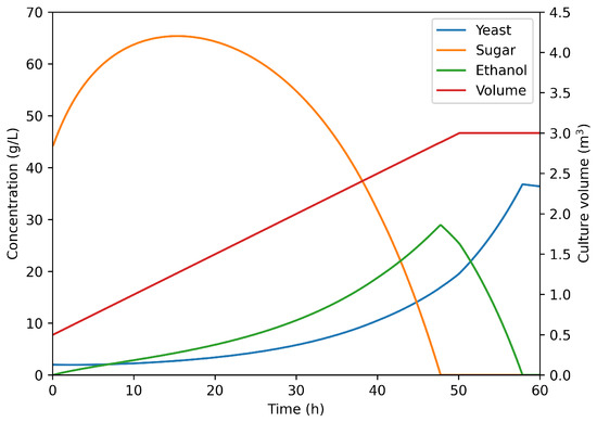 The numerically investigated fed-batch was led assuming a 3 m3 working volume fermenter initially filled with 500 L of regular hydrolysis medium. The medium was inoculated with a concentration of 2 g/L of yeast. A constant feed strategy was chosen as it is easy to operate. The feed flowrate was set at 50 L/h of concentrated hydrolysis medium until a volume of 3 m3 was reached (2.5 m3 of concentrated medium addition).