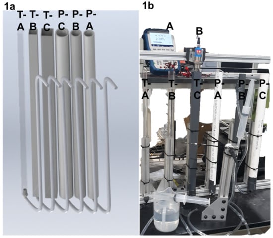 (1a) Experimental set-up sketch, (1b) picture of experimental set-up with (A) DSO and (B) ultrasonic sensor. All tubes and pipes are labeled with specifications provided in Table 1.