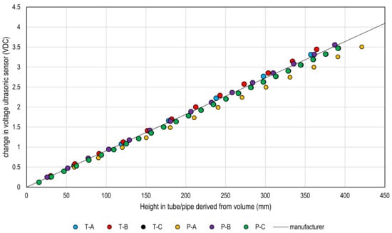 The calibration of all tubes and pipes were successful with all combinations showing a linear response, as seen in Figure 2 and Table 4. All pipes and tubes tested resulted in linear characteristics in relationship to the distance to the water surface, which is expected for intrinsically calibrated ultrasonic sensors []. The ANCOVA analysis showed that the slopes of the six linear regressions were significantly different, p < 0.05 as seen in Figure 3. The only pair of calibration that were not significantly different was the T-C and P-C p = 0.11, which notably have very similar CSA values. As all regression slopes were significantly different than P-B, the pipe for which the sensor is rated for, this demonstrates that the extrinsic factors under which an ultrasonic sensor is expected to perform can have a significant impact on the sensor’s response. This result support the justification for performing static calibrations of the ultrasonic sensor under operational conditions with each tube or pipe, which is a suggested practice for such ultrasonic sensors [,,]. Based on the calibration data, the P-A is advisably not a well-suited vessel for liquid volume measurement using the ultrasonic sensor approach due to the farthest linear regression values from the sensor manufacturer’s calibration. The P-B and P-C have calibrations that are closest in values to the sensor manufacturer’s specifications, and thus have an advantage for liquid volume measurement. Similar studies have shown the use of ultrasonic sensors to be well fitted and accurate for the liquid level in similar type of containers, though with much larger diameters relative to the sensors’ cone pattern [].