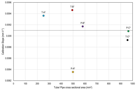 Cross-section area of tube/pipe (x axis) versus the calibration slope (y axis). Points not connected by the same letter are statistically significant, p < 0.05. The black line represents the manufacturer’s provided slope.