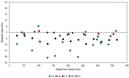 The calibration equation for each tube or pipe previously discussed was applied to the operational performance data. The volume calculation was determined by multiplying the calibrated height by the cross-sectional area for the respective tube or pipe, as seen in Equation (2). The residuals were calculated as the predicted height minus the known height (calculated from the volume added). The average residuals were calculated by tube and pipe. A residual plot, known height from volume (x axis), and residual value (y axis) was created to visualize trends in residuals from each tube/pipe.