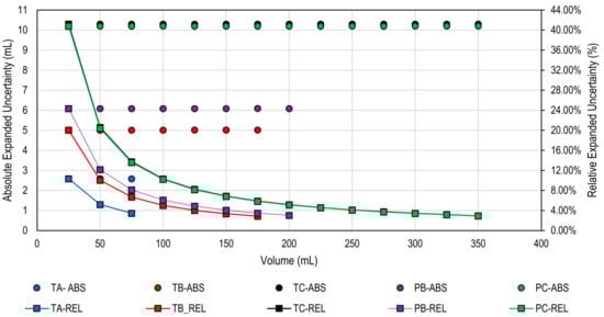 The relative expanded (coverage factor = 2; ~95% confidence level) uncertainty ranged from 10.2 to 10.5 mL depending on the tube/pipe for volumes ranging from 350 to 25 mL, respectively, as seen in Figure 5. Two major factors were identified as contributing the majority of the uncertainty: sensor accuracy and uncertainty in CSA. The sensor accuracy is equivalent to ± 11 mm of measurement, which is determined via the intrinsic calibration. Without selecting a different sensor or evaluating over-sampling methods, this source of uncertainty cannot feasibly be reduced in the system. The uncertainty in CSA increases with area linearly due to the tolerances from the pipe and tube manufacturers as the tolerances were inconsistent between manufacturers. Thus, the larger the tube or pipe, the large the uncertainty in the measurements. Addressing the CSA uncertainty in the future is the only feasible option for reducing the uncertainty in measurement. Utilizing a higher tolerance pipe or tubing would be the best approach. However, the overall holding capacity must be factored in as it will impact the system performance overall.