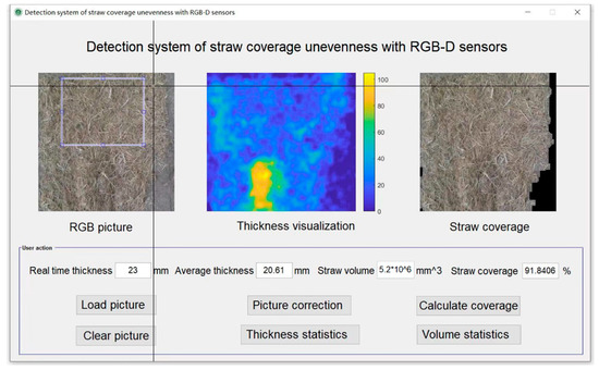 Detection system of straw coverage (shown in Figure 4) was developed by Matlab 2017b, which had the functions as follows: RGB color image show, ROI region clipping, thickness visualization, depth image data statistics and analysis, real-time acquisition and analysis of depth data on RGB-D image, image saving, ROI volume statistics, thickness statistics and straw coverage calculation, etc.