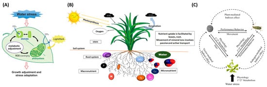 Crop stresses are significant constraints caused by biotic or abiotic factors that inauspiciously affect plant growth. When plants are stressed, different physiological symptoms may emerge; for example, water stress changes leaf color and limits water availability, thereby leading to stomata’s closing and impediment of photosynthesis and transpiration [14]. Figure 1 shows the representative stress types that can be occurred in plants. In Figure 1A, water stress is caused by a decrease in leaf water potential and stomatal heat, which leads to the down regulation in the availability of CO2, and is one of the main factors of excess light stress. Plant stomata change due to water stress, and metabolic changes occur. Plant roots absorb mineral elements from the soil; hence, Figure 1B demonstrates how mineral ions are absorbed and transported in the root system. Figure 1C shows direct and indirect interactions between insect vectors, pathogen-stressed plants, and hosts. The dotted line represents the indirect effect, and the solid line represents the direct effect.
