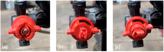 Three different nozzle types: TeeJet® (a) XRC 11004; (b) AIXR 11004; and (c) TTI 11,004. These nozzle types were used to attain medium, very coarse, and ultra-coarse spray droplets, respectively, [16] in this study.