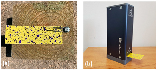(a) Illustration of data collection setup (wooden block and water-sensitive paper) used in the field, and (b) the DropScope instrument used for analyzing water-sensitive paper.