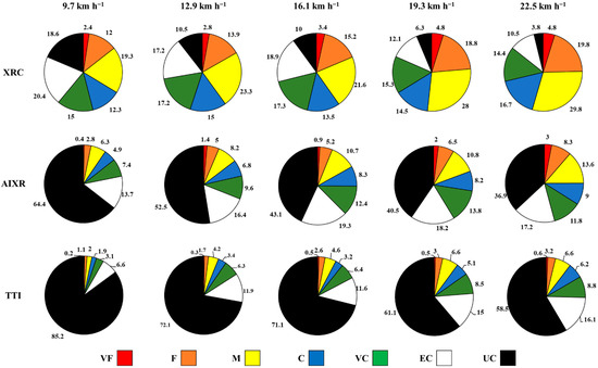 Spray quality (droplet size classification based on volume median diameter) for XRC, AIXR, and TTI nozzles at varying ground speeds for SRC. SRC represents the sprayer equipped with a rate controller while XRC, AIXR, and TTI represent TeeJet® extended range, air induction extended range, and turbo-teejet induction nozzle type, respectively, used in this study. VF, F, M, C, VC, EC, and UC represents the very fine, fine, medium, coarse, very coarse, extremely coarse, and ultra-coarse spray droplets, respectively, as defined by the ASABE S572.3 [16].