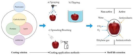 The coating-forming solutions can comprise a single main component from proteins, polysaccharides, lipids, or a mixture of them to achieve desired properties [35]. New edible coating candidates should be inexpensive and available in large quantity. The coating should provide easy application, have good adhesive characteristics, and dry quickly with uniform thickness. Moreover, the coating performance and structural stability must be maintained during long-term storage. The coating must be flexible enough to adapt to specific morphological changes such as fruit shrinkage or mechanical damage [36].