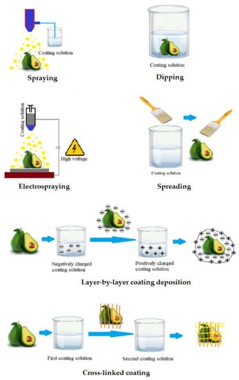 The layer-by-layer deposition method is based on the electrostatic interactions of the food surface with charged polyelectrolytes. These electrostatic interactions improve adhesion of the coating to the food surface and may be used to create coatings with two or more thin layers that are chemically or physically linked to each other. Such linked multilayer coating improves the effectiveness compared to conventional edible coatings [62]. The use of the multilayer coating approach to increase the compactness of the coating layers during postharvest storage of fruits were documented for polysaccharides and charged polyelectrolytes capable of hydrogen and covalent bonding. Polysaccharides and charged polyelectrolyte demonstrated efficiency in fruit preservation when applying the multi-layer coating method to improve the tightness of the coatings [63].