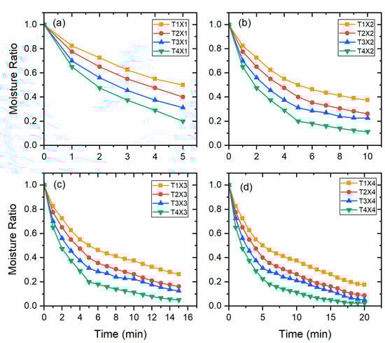The moisture ratio changes with FIR exposure times: (a) 5 min, (b) 10 min, (c) 15 min and (d) 20 min for different temperatures.