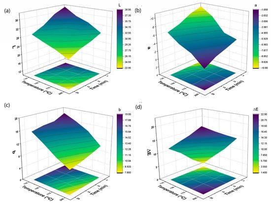 The color values L (0 = black, 100 = white), a (−a = greenness, +a = redness) and b (−b = blueness, +b = yellowness) were measured using a colorimeter (Minolta CR 300, Tokyo, Japan). The total color difference (ΔE) was calculated using Equation (3) [20].