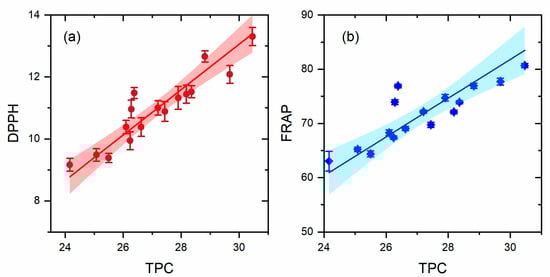 The correlation analysis of TPC with DPPH (IC50) (a) and FRAP (b) values. The error bars show the standard deviation (n = 5). The color shades indicate 95% confidence intervals.