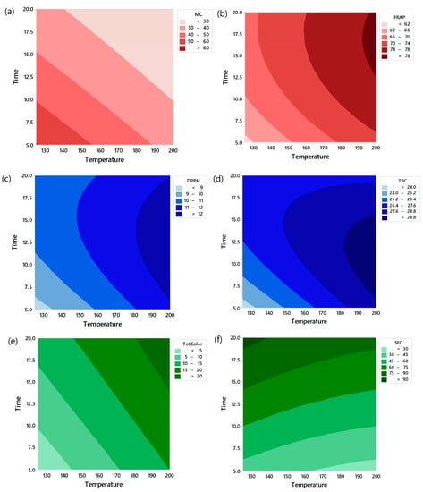 The response surface plots for all the response variables and drying parameters are shown in Figure 5. The optimum level of TPC, FRAP and DPPH were reached at high temperatures (Figure 5b–d). The optimum total color was reached at low temperature (Figure 5e), whereas optimum moisture content and SEC were obtained at high temperature (Figure 5a,f). The optimum drying conditions of G. sylvestre leaves using FIR was determined to obtain minimum SEC and ΔE, maximum values for TPC, DPPH and FRAP, and the target value of final moisture content. Each response variable was given equal weight and importance for calculating the optimum drying conditions. The optimum drying conditions obtained by the desirability function method were 200 °C and 8.4 min of exposure time. These optimum conditions provide 38.6 MJ kg−1 H2O of SEC, 17.0 of ΔE, 29.2 mg TAE/g leaf fresh weight of TPC, 12.3 mg mL−1 of DPPH (IC50), 75.8 μmol g−1 leaf fresh weight of FRAP and 31% of moisture content (w.b) and the composite desirability value for these drying conditions was 0.62.