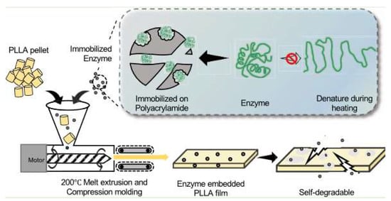 The nascent biological degradation technology could further complicate the ease of adoption for enzyme-embedded polymers [76,77,78]. Scholarly findings recommended different strategies for enzyme infusion into the polymer structure. On the one hand, Greene et al. [2] opted to integrate enzymes into polycaprolactone/Amano lipase (PCL/AL), while Huang et al. [13] emphasized the suitability of proteinase K-derived Tritirachium album enzyme-embedded PLA films, which recorded a 78% weight loss after 96 h. On the other hand, Tang et al. [15] used a different strategy (metal-nanoparticles–enzyme complexes and carbon-particle–enzyme complexes).