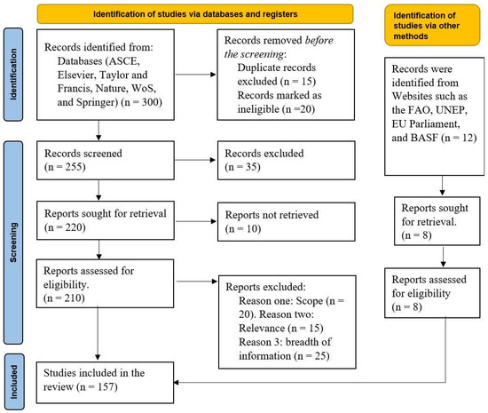 The review approach was critical to addressing gaps in the knowledge on synthetic plastic waste using enzyme-embedded biodegradable agricultural plastics and microbial degradation to achieve better sustainability. Brings et al. [27] noted that in-depth reviews were reliable and less biased than ad-hoc reviews. Additionally, conducting systematic reviews in agricultural engineering is an established practice [18,28,29]. A key step in the review was determining the search strategy approaches for extracting literature from scholarly databases, such as Springer, Nature, IEEE, Taylor and Francis, and Web of Science. The three search strategies (manual, automated, and snowballing) recommended by Bogner et al. [30], were employed to reduce the number of missed articles on enzyme-embedded and microbial degradation. Automated searches involve the application of pre-defined search strings. The manual searches were limited to hard-copy books and articles.