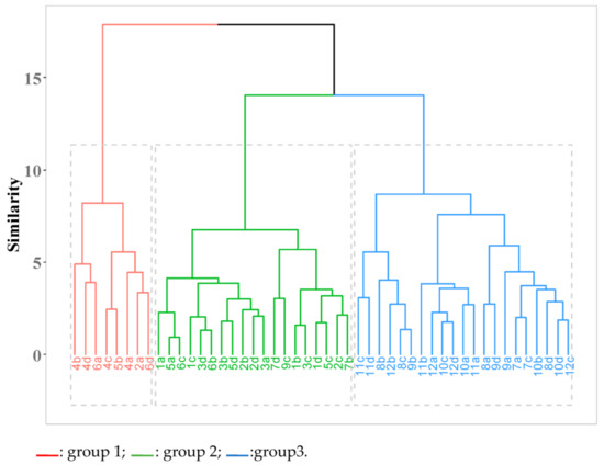 Next, the similarities between the experimental units were determined using the Euclidean distance method, and Ward’s method was used for hierarchical clustering [16]. The statistical difference between groups was verified by subjecting the clusters to the F-test and then to the Tukey mean-difference test when the number of groups was greater than two. After that, the main characteristics in the cluster were analyzed and the factor that predominates in the cluster (droplet size, application rate or mixture composition) was considered the factor with the most significant influence on the spray deposition.