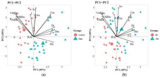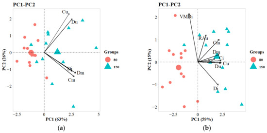 Biplot graph of principal components one and two with separate plots according to application rate on the corn crop. (a): Fine droplet class. (b): Coarse droplet class. VMD: volume median diameter; RA: relative span factor; C: coverage area; D: droplet density in the thirds u: upper; m: middle i: lower.