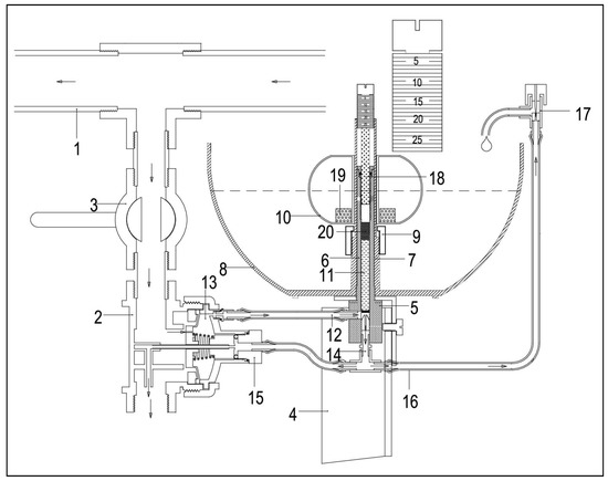 Details of the HEM prototype: (1) pressurized irrigation system; (2) hydraulic irrigation valve; (3) faucet; (4) iron pole; (5) fixture supporting the magnetic hydraulic valve; (6) stem of the magnetic hydraulic valve; (7) base pipe fixed perpendicularly at the base of the evaporation pan; (8) evaporation pan; (9) ring screw to stop the floater at the right level; (10) ring screw; (11) magnetic rod; (12) small pipe; (13) chamber of the valve; (14) outlet of the magnetic hydraulic valve; (15) adaptor replacing the solenoid; (16) water return pipe; (17) adjustable dripper; (18) frequency screw; (19) permanent magnet; (20) magnetic component of the rod [22].