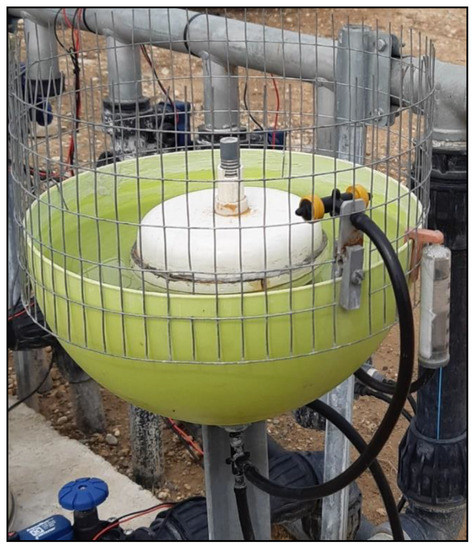 As the original irrigation schedule was prepared for average weather conditions, the highest average daily value of evaporation recorded in a Class A evaporation pan in Cyprus was 9 mm, which was for the hottest month, and this value was used as a guide. However, it was expected that the corresponding drop in the water level in the evaporation pan would be less, because part of the area of the pan was covered by the floater, and the pan was not filled up to the edge. The daily drop in the water level accepted in this case was 7 mm, considering Equation (1) and several comparisons between the water evaporation measured with the HEM and the potential evapotranspiration calculated with the Penman–Monteith equation based onsite climatic data, as mentioned in [12].