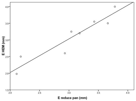 The linear regression analysis that was developed considers the water evaporation rate from the HEM (E HEM, mm) as a predictor and the water evaporation rate from the reduced A pan evaporimeter (E reduce pan, mm) as the dependent variable (Figure 3). For a specific time period, the mean values of the E HEM (mm) was shown to be a significant predictor for the E reduce pan (mm), with a coefficient of determination of r2 = 0.98.