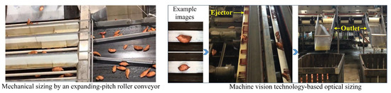 Photographs of automated mechanical (left) and optical (right) sizing of sweetpotatoes. The photographs were taken by the authors during the packinghouse visits in December of 2021.