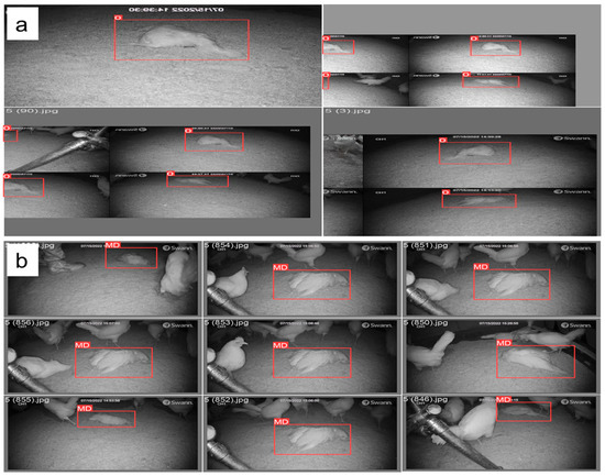 The video data collected in this study were processed by converting them into individual images in .jpg format using the Free Video to JPG Converter App (version 5.0). Subsequently, the obtained images were augmented to create a large image dataset. Techniques such as rotation, blurring, flipping, and cropping were employed in this study for image augmentation. These methods allowed the generation of additional variations of the collected images, increasing the diversity and size of the dataset for training, validating, and testing the detection models. The images were then labeled in YOLO format with the assistance of the image labeler website (Makesense.AI). This labeling process was essential in ensuring the images were correctly identified and classified for use in the deep learning model. Furthermore, the resulting labeled dataset was essential in developing and training the model for effective and accurate MD (Figure 2). The labeled-image dataset consisting of 9000 images was divided into three sets for training, validation, and testing purposes, with approximately 70%, 20%, and 10% of the total images allocated to each set, respectively (Table 2). The MDModel image dataset was used to compare YOLOv5s, YOLOv5m, YOLOv5x, YOLOv6s, YOLOv6m, and YOLOv6l-relu models.
