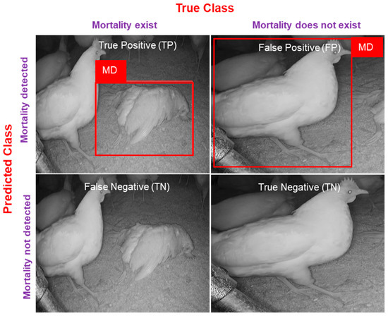 The limitation of this study was the use of limited mortality image datasets, which might not fully represent the variable conditions found in commercial CF housing. However, these datasets provide an overview of such conditions. Additionally, there were instances where resting birds were mistakenly identified as dead birds, highlighting the need to introduce a thermal camera for accurate identification. The thermal camera would measure the hen’s body temperature, allowing differentiation between live and dead birds. In future research, it would be valuable to test and implement this study in real-world commercial CF houses, evaluating the model’s performance under authentic conditions. Furthermore, to enhance the MD model, further work can be conducted using larger image datasets incorporating a thermal camera and temperature and humidity sensors as additional tools.