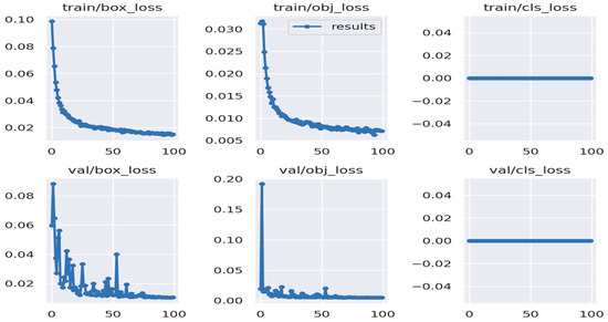 Loss function results sample for the YOLO-MD model. Where train, val, box, obj, and cls represent the training, validation, bounding box, bounding object, and class used to detect MD.