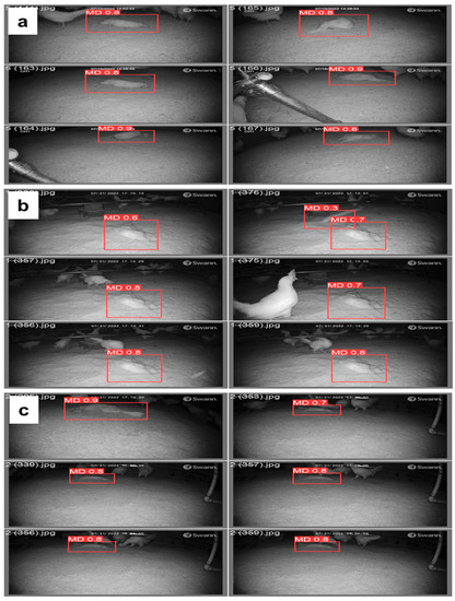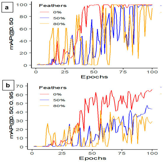 Table 4 summarizes the performance of YOLOv5s-MD with different feather percentages (e.g., 0%, 50%, and 80%). Precision remains relatively consistent across all three models, with recall being the highest at 100% for 50% feather covering. The mAP and F1-scores also show a slight decrease with an increased feathering percentage. The mAP@0.50 score is highest for 0% feather covering at 99.4% and decreases to 98.0% for 80% feathered covering (Figure 7a). The mAP@0.50:0.95 score shows a significant decrease in performance with increased feathering, with 0% feather covering achieving a score of 65.5%, compared to 41.6% for 80% feather covering (Figure 7b). Hence, 0% feather covering resulted in higher MD rates (Figure 8). The mAP scores always increased with increasing epochs from 0 to 100 with batch size 16. However, there is a trade-off between feathering and overall mAP performance, with higher feathering resulting in decreased performance. Therefore, early mortality detection or proper cleaning and maintenance of CF housing is required to increase detection.