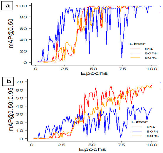 Mean average precision performance (a) mAP@0.50 and (b) mAP@0.50:0.95 using the YOLOv5s-MD model at 100 epochs and 16 batch sizes in detecting dead hens at different percentages of litter coverages.